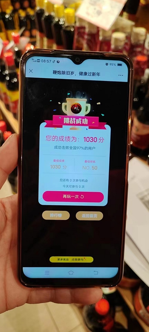 如果說(shuō)去年的貼窗花活動(dòng)讓許多小伙伴們意猶未盡的話(huà),那今年的放爆竹活動(dòng)可真是讓大家過(guò)足了癮。這項活動(dòng)不僅考驗小伙伴眼明手快,而且要充分發(fā)揮小伙伴們的智慧,才能拿下最高分。在開(kāi)始挑戰之前,就有小伙伴邀約其他同事助力,齊心協(xié)力共同點(diǎn)燃爆竹,爭取獲得更高積分;還有的小伙伴憑借去年的豐富經(jīng)驗及嫻熟的技巧,進(jìn)入小程序后,熟練輕松地拿下了高積分。值得一提的是各個(gè)分會(huì )積極宣導工會(huì )活動(dòng),在例會(huì )上親自傳授經(jīng)驗,伴隨著(zhù)小伙伴的歡笑聲,愉快的氛圍達到最高點(diǎn),開(kāi)啟了能量滿(mǎn)滿(mǎn)的每一天。